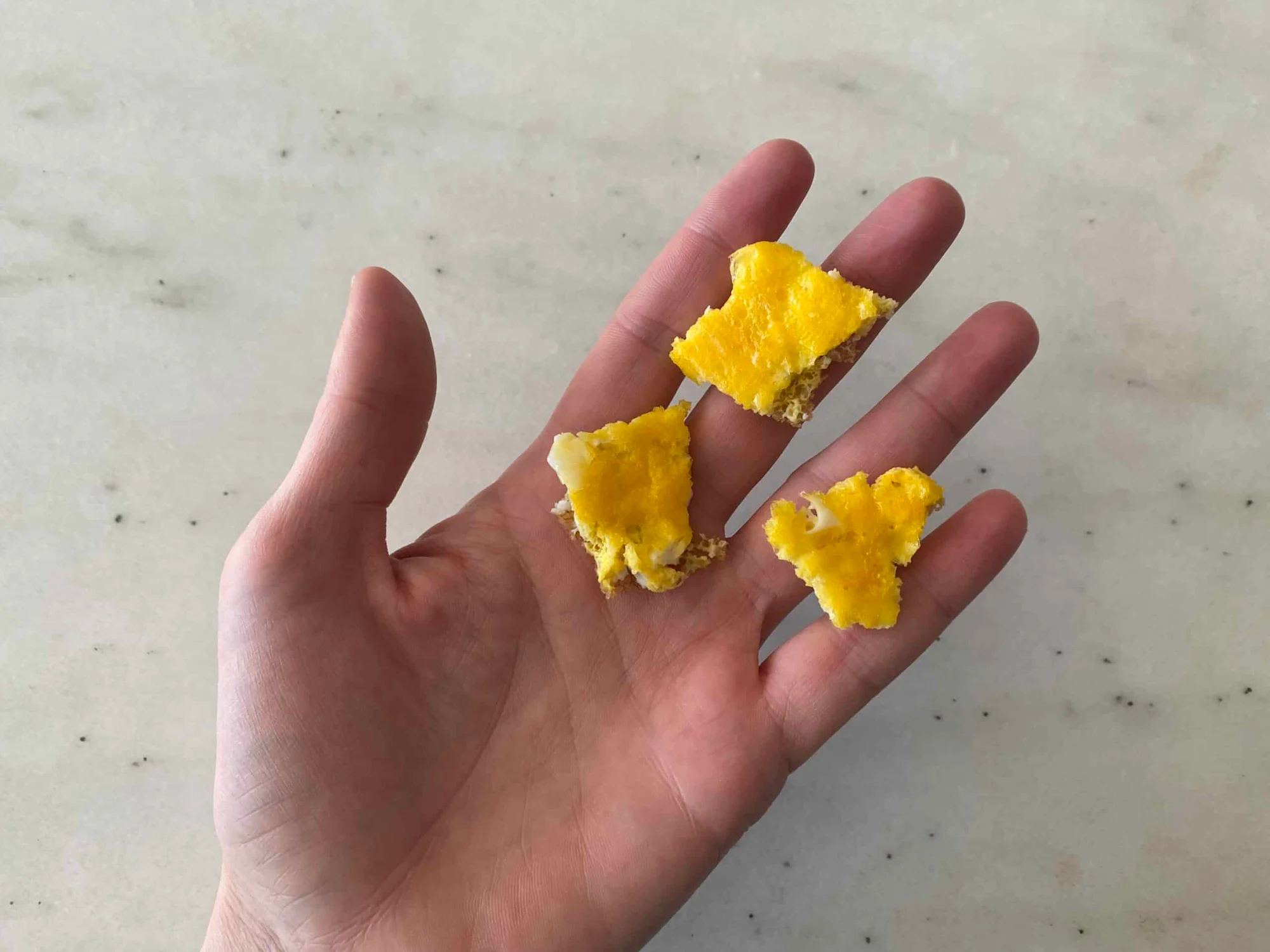 وقتی نوزاد علائم گرفتن پینسر (درست کردن انگشت شست و اشاره) را نشان داد، میتوانید اندازه نوارهای تخممرغ را کوچکتر کرده و تکههای کوچک تخممرغ، تخممرغ همزده یا تخممرغ آبپز را به او بدهید. اگر تخممرغ آبپز بهصورت تکههای کوچک ارائه میشود، مقداری شیر مادر، شیر خشک یا آب در یک فنجان در کنار آن قرار دهید تا به نوزاد کمک کنید تخممرغ را راحتتر قورت دهد، زیرا ممکن است خوردن آن در دهان برایش چالشبرانگیز باشد. در غیر این صورت، میتوانید همچنان نوارهای تخممرغ یا تخممرغ آبپز لهشده را ارائه دهید. برای کاهش خطر واکنش آلرژیک، اطمینان حاصل کنید که تخممرغ به دمای 160 درجه فارنهایت (71 درجه سلسیوس) پخته شده باشد.